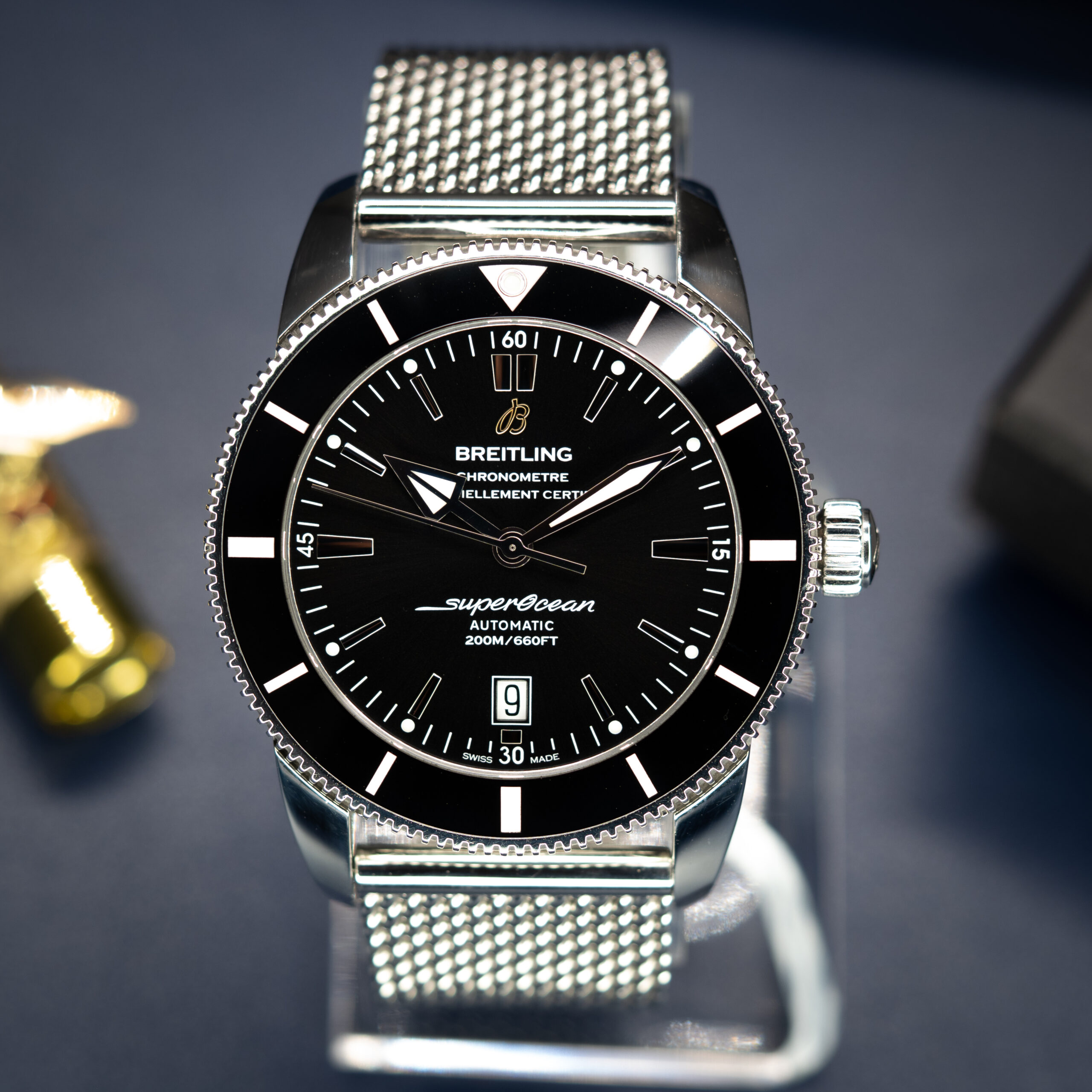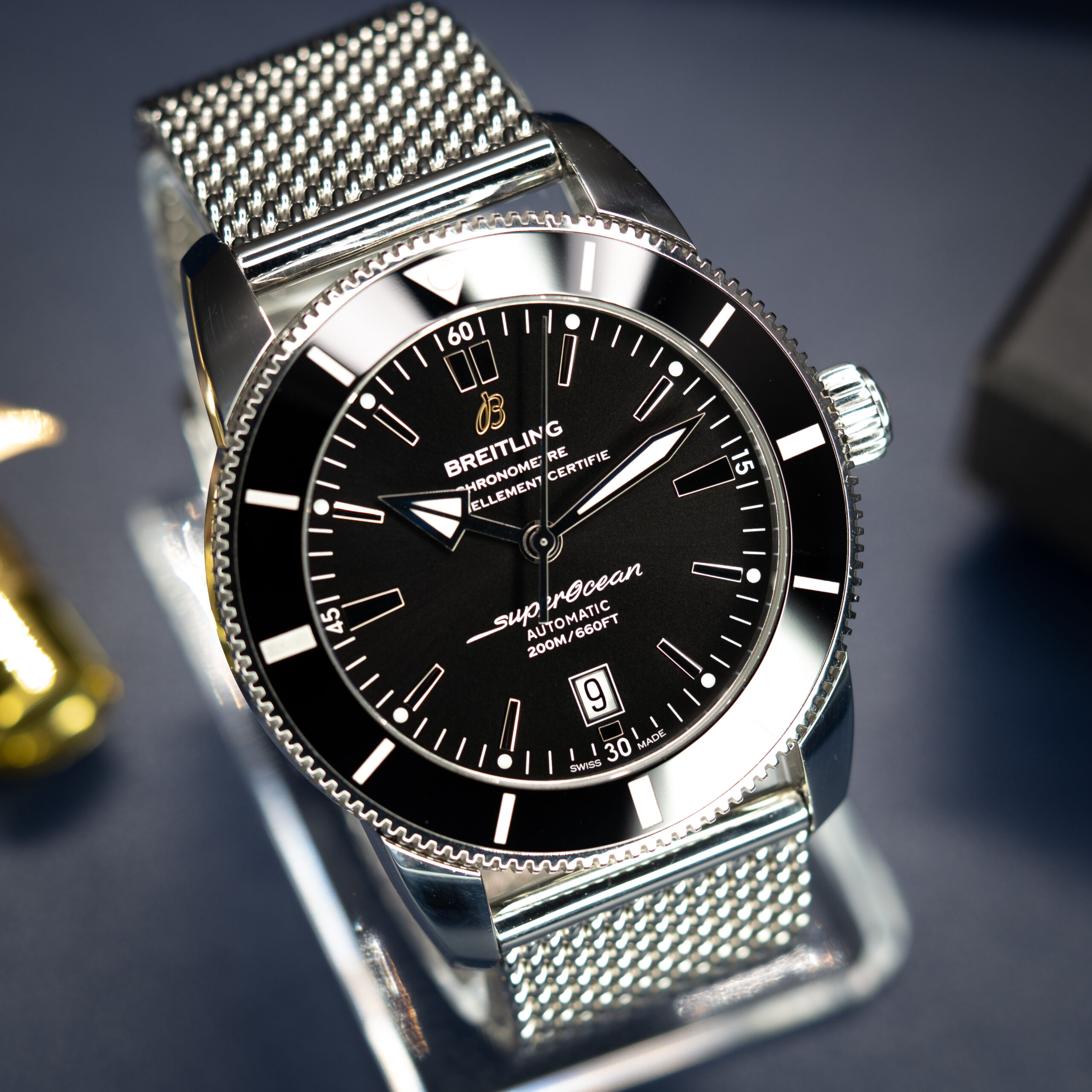The Breitling Superocean Heritage II 46 is a bold, commanding diver that honours the brand’s 1957 deep-sea legacy while delivering thoroughly modern performance. The 46mm stainless steel case, ceramic unidirectional bezel, and 200m water resistance make it a serious tool watch — yet its vintage-inspired dial and mesh bracelet give it a style that transitions effortlessly above water. A statement piece for those who want their diver to be anything but subtle.